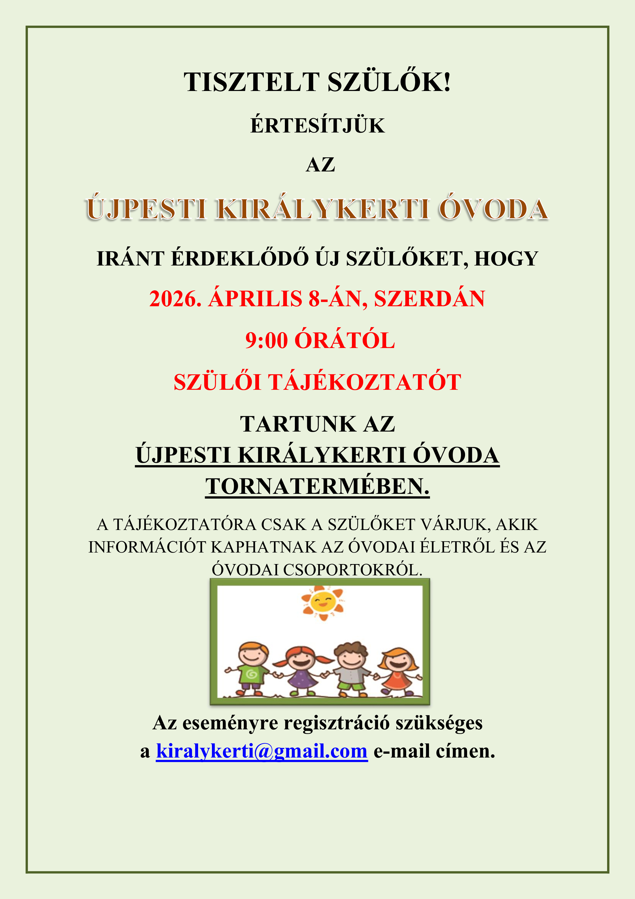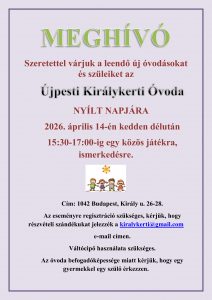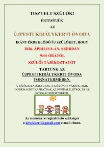 Az alábbiakban megtekinthetik a Királykerti Tagóvoda Szülői tájékoztatójának és Nyílt napjának időpontját.